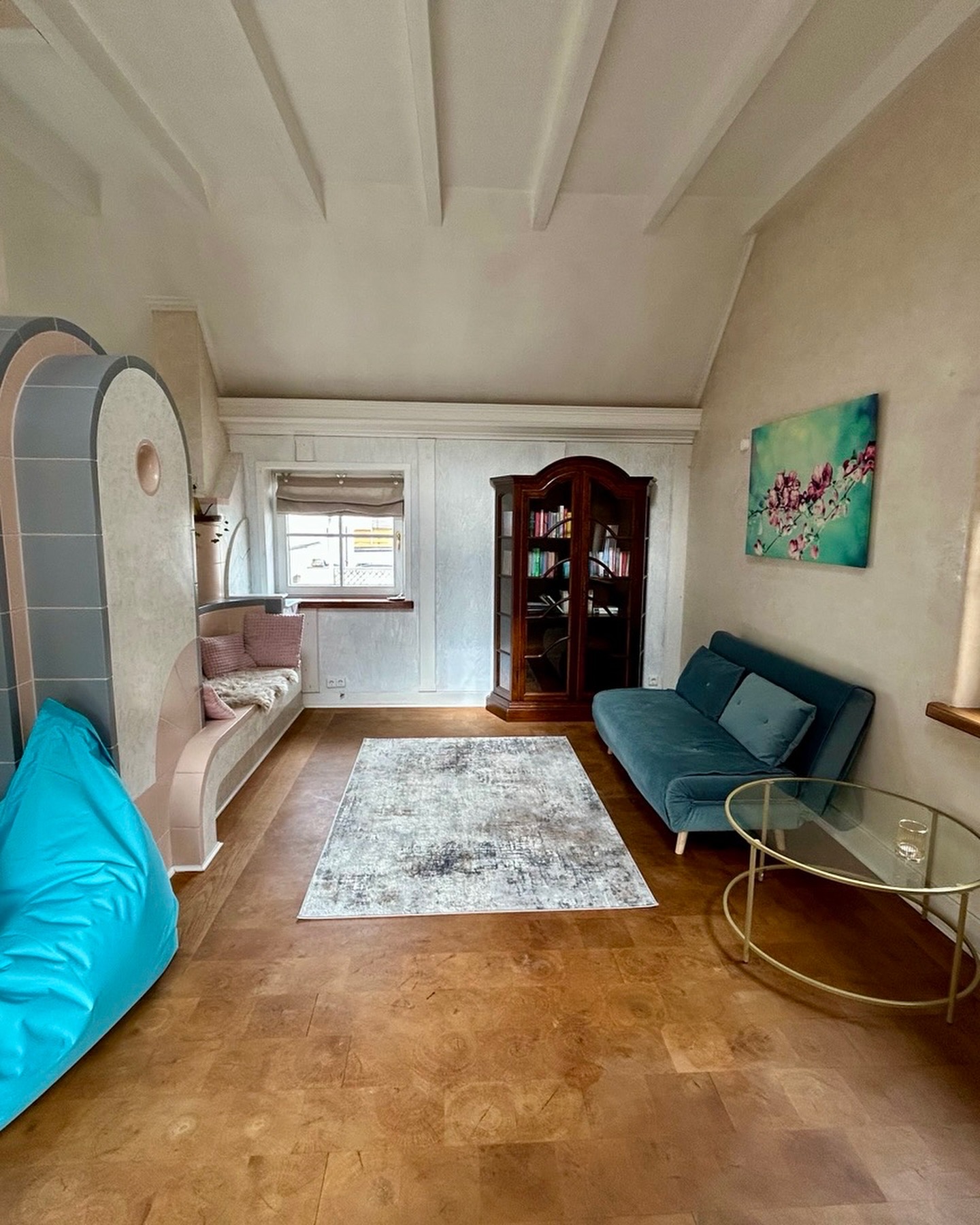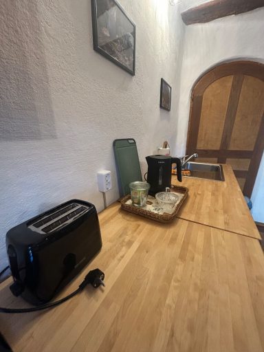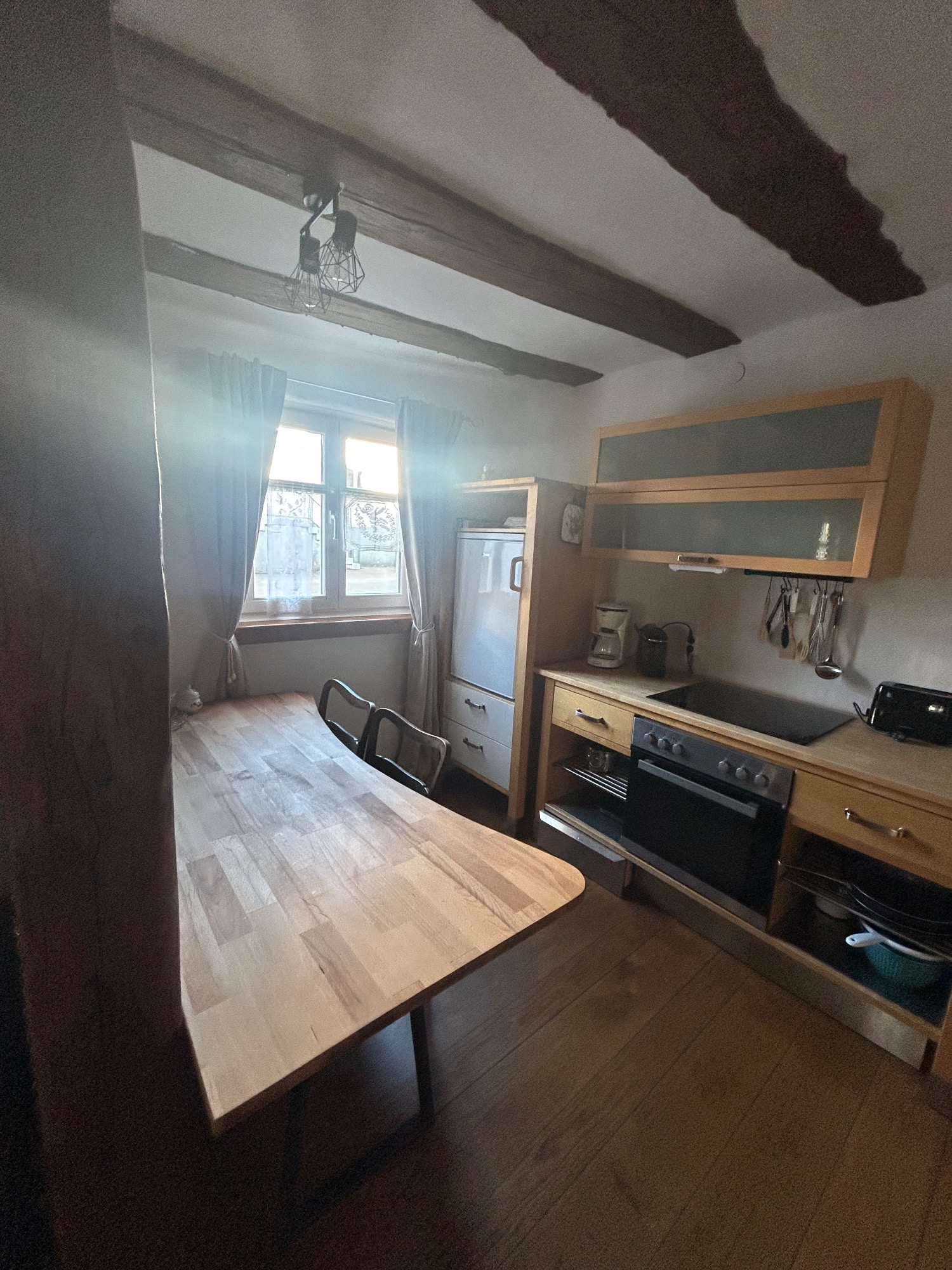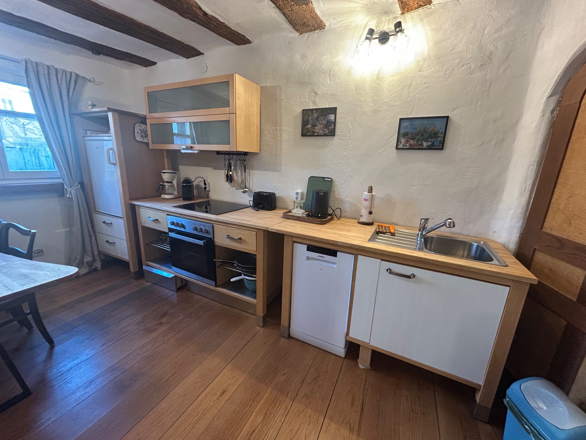 Vom Innenhof gelangst du durch die alte Eingangstür in einen kleinen Flur. Auf der linken Seite befindet sich die ehemalige Wohnstube mit Kachelofen und Holzbalken. Die Stube haben wir mit einem gemütlichem Boxspringbett (1,60m), Holzschreibtisch, Sofa, Hängesessel und Einbauküche mit Esstisch ausgestattet (Platz für 4 Personen). Die Holzküche verfügt über einen Herd mit Backofen, einen Kühlschrank sowie eine kleine Spülmaschine. Auf der rechten Seite befindet sich ein Schlafzimmer mit Blick in den Garten. Hier schläfst du auf einem Futon-Doppelbett (1,40m) und findest einen alten Standkamin. Das weiß gekachelte Badezimmer erreichst du direkt durch den Flur.